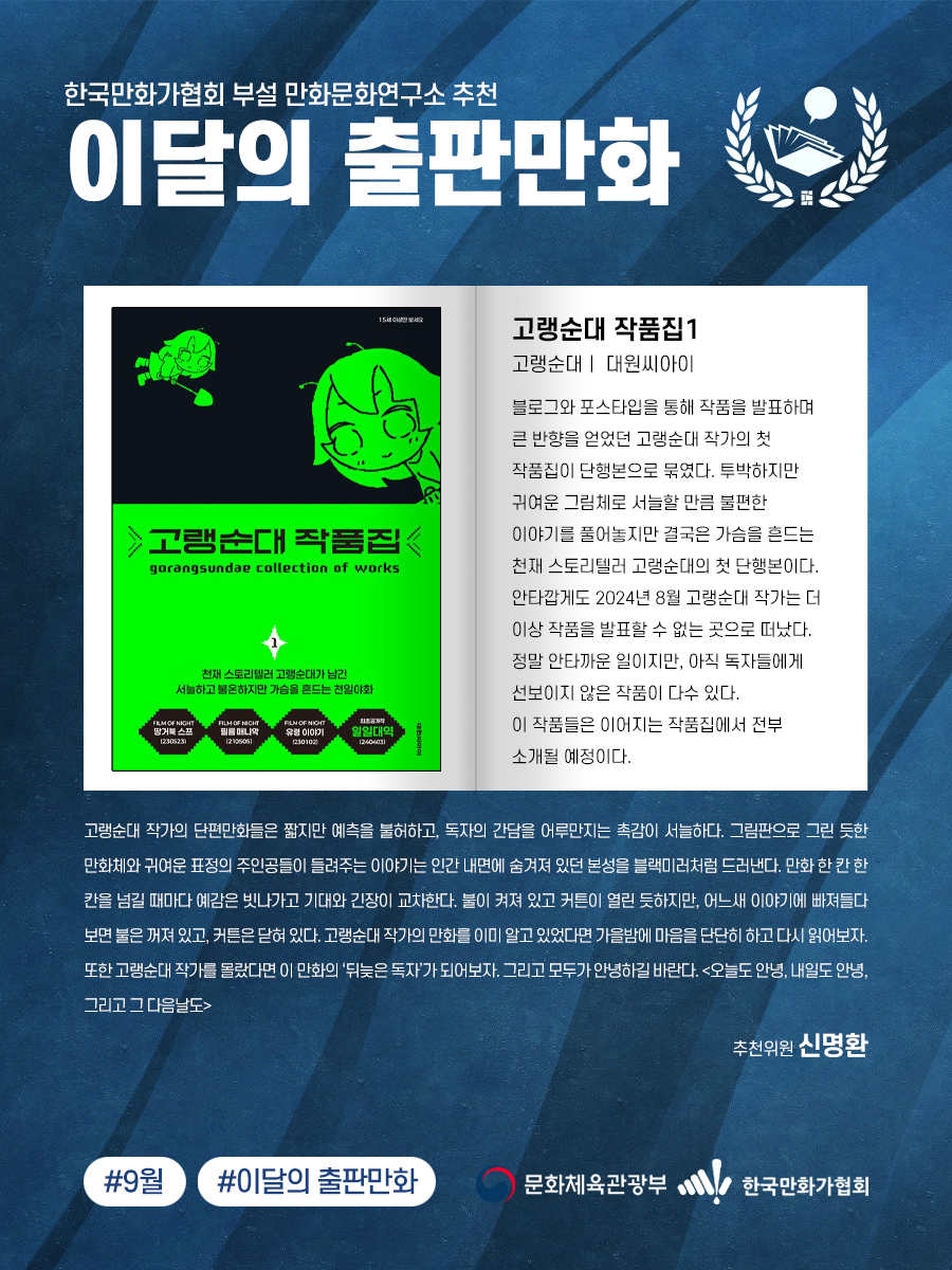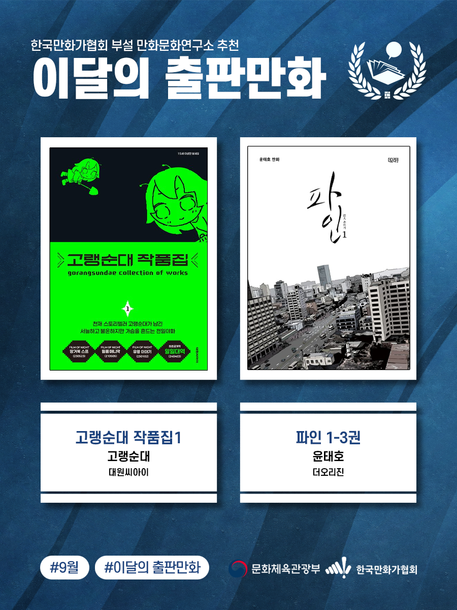 한국만화가협회 부설 만화문화연구소(이하 만화문화연구소)는 2025년 9월 ‘이달의 출판만화’로 <고랭순대 작품집1>, <파인(전3권)>를 각각 추천하였다.