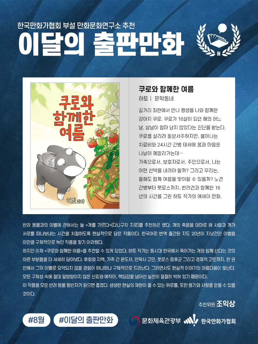 《쿠로와 함께한 여름》(저자 하토 / 문학동네 펴냄)은 길거리 좌판에서 만나 평생을 나와 함께한 강아지 쿠로가 16살이 되던 해의 어느 날, 병에 걸려 살날이 얼마 남지 않았다는 진단을 받은 내용을 담은 이야기이다. 쿠로를 살리려 동분서주하지만, 불어나는 치료비와 24시간 간병 태세에 몸과 마음은 나날이 메말라가는데… 가족으로서, 보호자로서, 주인으로서, 나는 어떤 선택을 내려야 할까? 그리고 우리는, 올해도 함께 여름을 맞이할 수 있을까? 노견 간병부터 펫로스까지, 반려견과 함께한 16년의 시간을 그린 하토 작가의 에세이 만화.