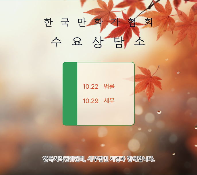 한국만화가협회와 한국저작권위원회 '찾아가는 저작권법률지원단', 세무법인 지경이 함께 만화가를 위한 법률 상담과 세무 상담을 지원합니다.