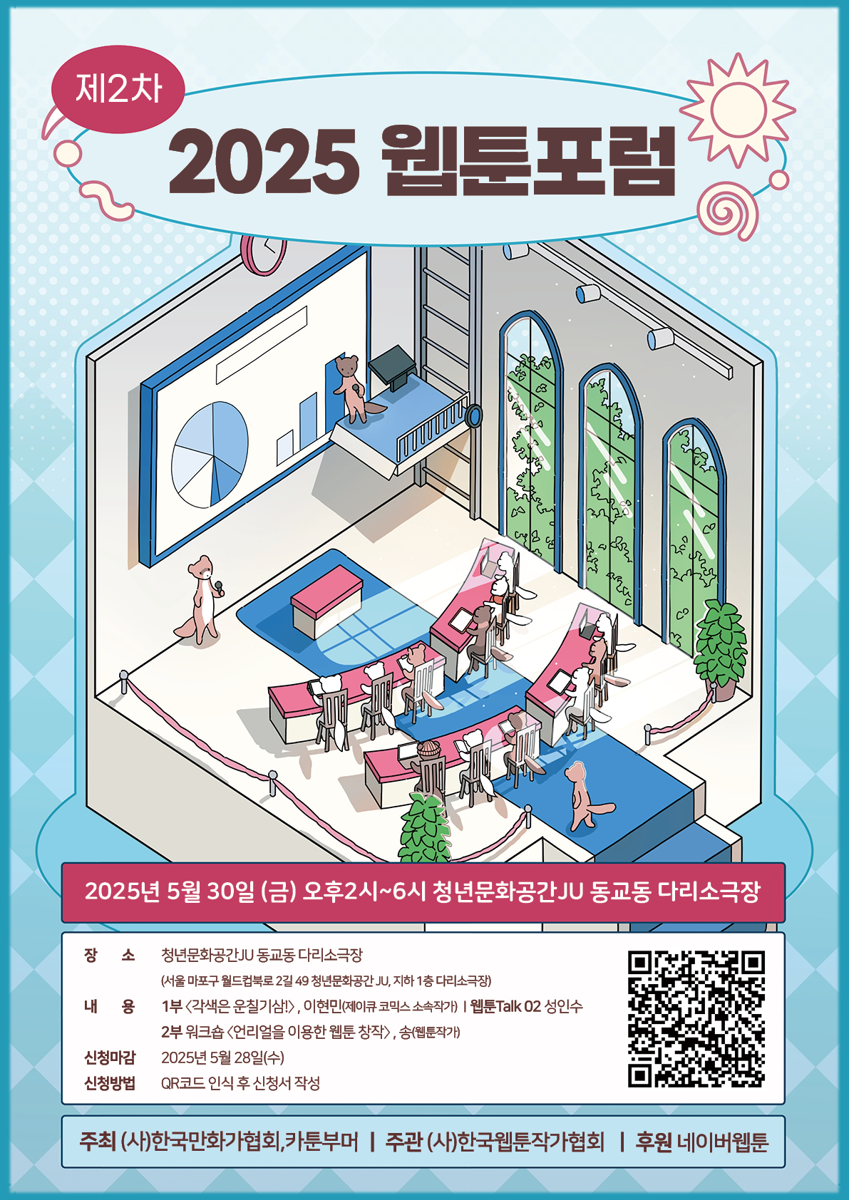 (사)한국만화가협회와 카툰부머(CartoonBoomer)가 공동 주최하고 (사)한국웹툰작가협회(회장 권혁주)가 주관하는 2025년 2차 웹툰포럼이 오는 5월 30일, 홍대 다리 소극장에서 진행된다.